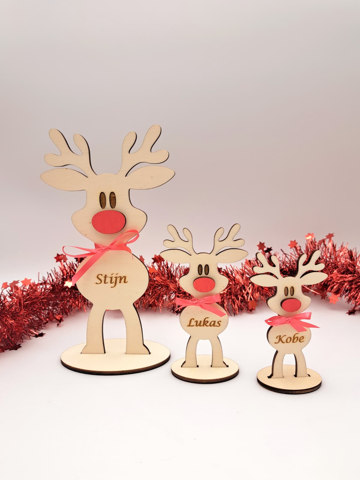 Breng warmte en gezelligheid in huis met deze schattige houten rendieren, volledig personaliseerbaar met een naam naar keuze. Elk rendier is fijn afgewerkt, heeft een vrolijke rode neus én draagt een rood sjaaltje voor die extra feestelijke touch.